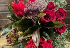 冬、クリスマスカラーの「赤」。 深い赤バラを中心に季節の赤色の花々を組み合わせ、華やかな雰囲...