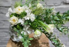 洗練されたホワイトをテーマに、白色の花々と春の枝ものを組み合わせたブーケづくり。 チューリッ...