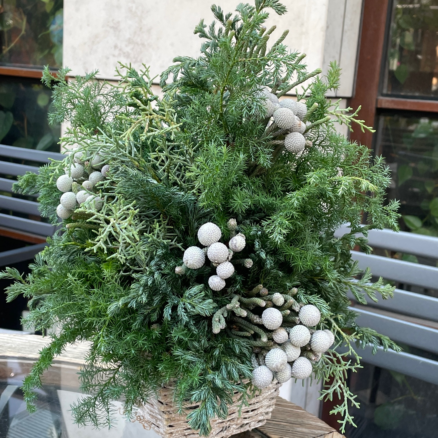 スギやヒノキなどのエバーグリーンをオアシス(吸水性スポンジ)に挿し、ツリー型にアレンジ。