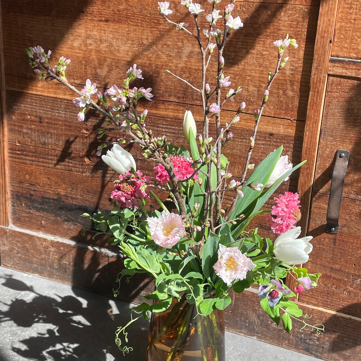 今回は桜の枝に春の花々を合わせ、濃淡のピンク色づくしで、ロマンティックな雰囲気に束ねます。
