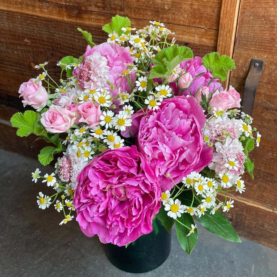 華やかなピオニーに、繊細な花・マトリカリアを組み合わせて。